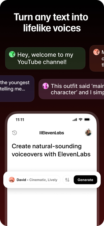ElevenLabs, içerik üreticileri için tasarlanmış bir yapay zeka ses üretici uygulamasıdır. Kullanıcılar, TikTok, Instagram ve YouTube gibi platformlarda yüksek kaliteli ses içerikleri oluşturmak için bu uygulamayı kullanabilirler. Uygulama, insan benzeri sesler sunarak metni sesli hale dönüştürmeyi sağlar. Kullanıcılar, geniş bir premium ses seçeneğinden faydalanarak, seslendirme, podcast ve hikaye anlatımı gibi içerikler üretebilirler.